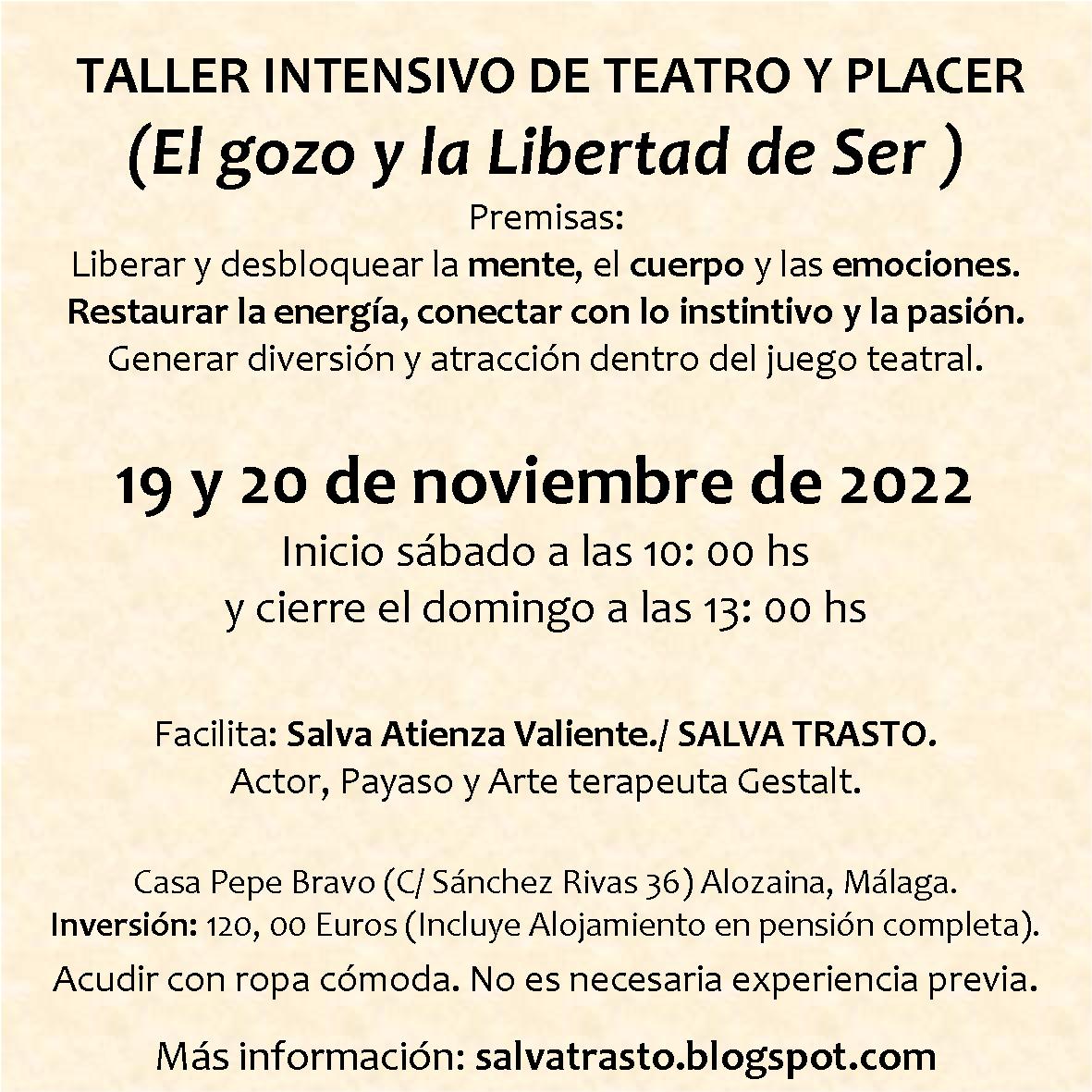 Tienes toda la información en este enlace: TALLER INTENSIVO DE TEATRO Y PLACER